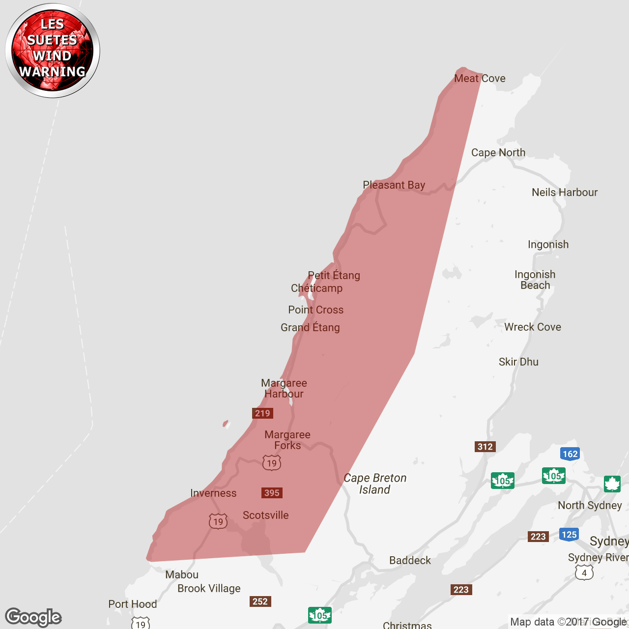 A low pressure system will develop over southern new england this afternoon then cross southern new brunswick overnight tonight to lie over the gulf of saint lawrence friday afternoon. Strong southeast winds will develop across cape breton later tonight with les suetes gusts up to 100 km/h expected overnight and friday morning. Winds will shift to southwesterly and diminish by noon friday.