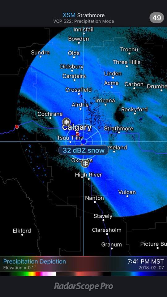- Radar Image from Radarscope evening of February 7, 2018 beginning of the winter storm at Calgary with snowfall rates 5-8 cm an hour!! (Courtesy of RadarScope)*