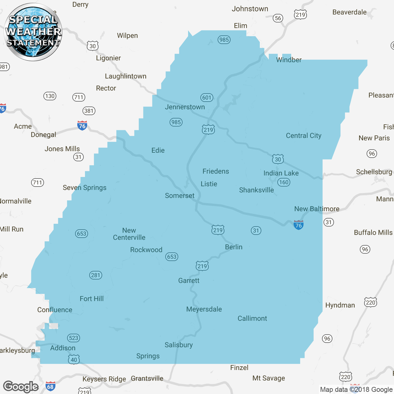 ...A STRONG THUNDERSTORM WILL AFFECT PARTS OF SOMERSET COUNTY UNTIL 615 PM EDT... At 548 PM EDT, Doppler radar indicated a strong thunderstorm near Jerome, moving southeast at 40 mph. Pea size hail and wind gusts up to 50 mph are possible. Locations impacted include... Windber, Davidsville, Boswell, Paint, Central City, Ogletown, Tire Hill, Jerome, Scalp Level, Benson, Stoystown, Indian Lake, New Baltimore, Hooversville, Jennerstown and Flight 93 National Memorial.