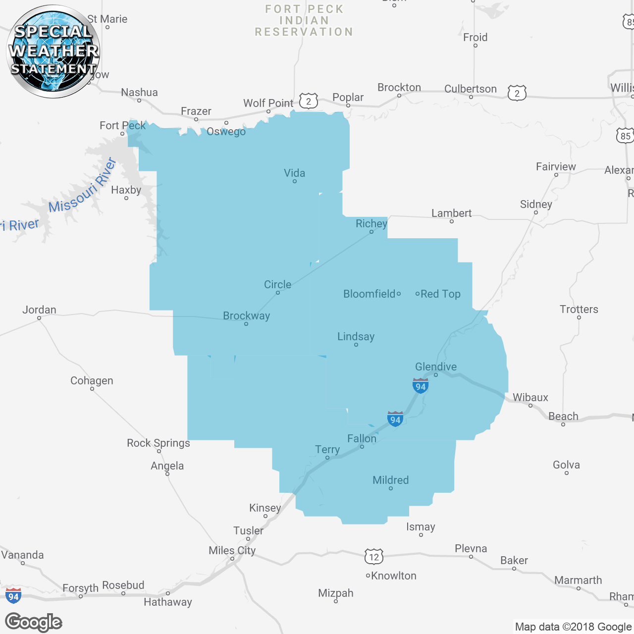 ...SIGNIFICANT WEATHER ADVISORY FOR SOUTHEASTERN MCCONE...CENTRAL PRAIRIE AND DAWSON COUNTIES UNTIL 145 AM MDT... At 1250 AM MDT, Doppler radar was tracking a cluster of strong thunderstorms 9 miles northwest of Lindsay, or 15 miles southeast of Circle, moving southeast at 30 mph. Half inch hail and winds in excess of 40 mph will be possible with this storm. Locations impacted include... Glendive, Fallon, Bloomfield, Intake, West Glendive, Lindsay, Brockway, Hoyt, Forest Park, Stipek and Marsh.