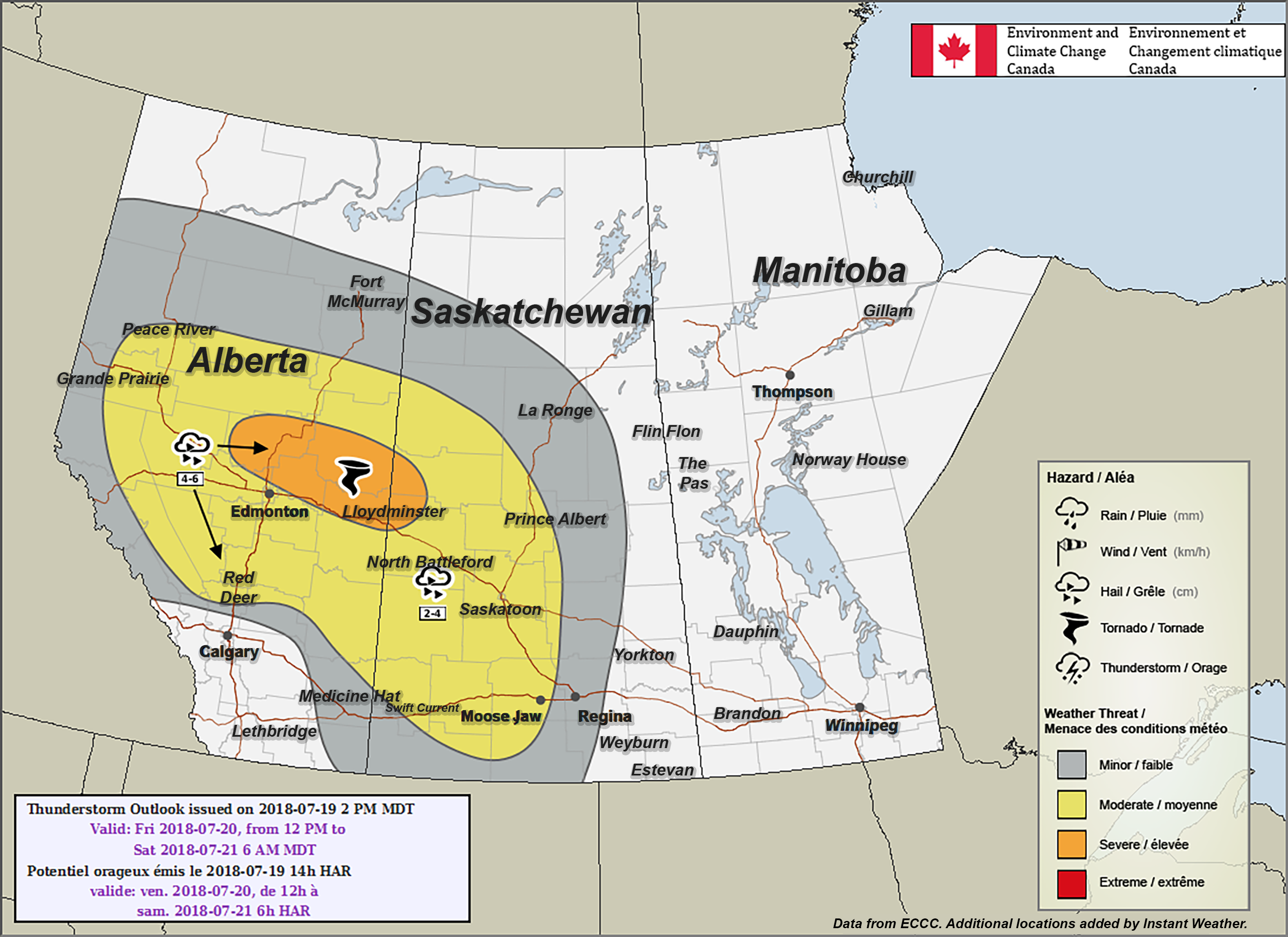 FRIDAY: Edmonton, Red Deer, Grande Prairie & Lloydminster are Included in Environment Canada's Forecast for up to Tennis Ball Hail and Risk for a Tornado (Fri, July 20th, 2018)