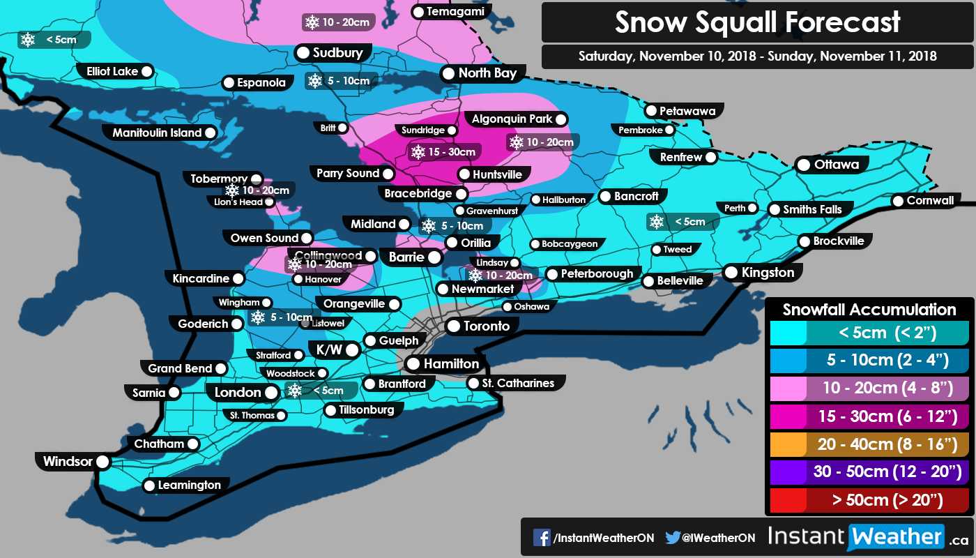 The squall itself will be slowly weakening as it works its way down south so higher accumulation (10-15cm; locally 20cm) is expected in Muskoka and the northern section of the Bruce Peninsula with lower amounts (5-10cm) further south for the rest of the Bruce Peninsula and Simcoe County. The remnants of the squall could reach as far south as the northern GTA and affect travel along the Hwy 400 corridor though accumulation will be limited to at most 5cm.