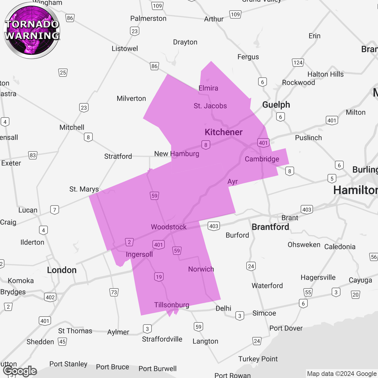 Locations impacted include: Kitchener, bright, plattsville, drumbo, mannheim, new dundee, roseville, East Kitchener, breslau and preston.