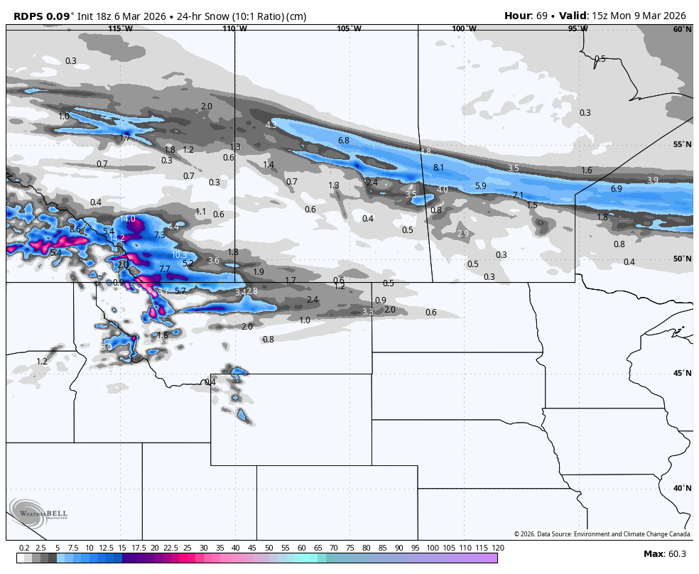 The rdps model showing 24 hour snowfall amounts as of 9am mt on Monday. courtesy of WeatherBell.