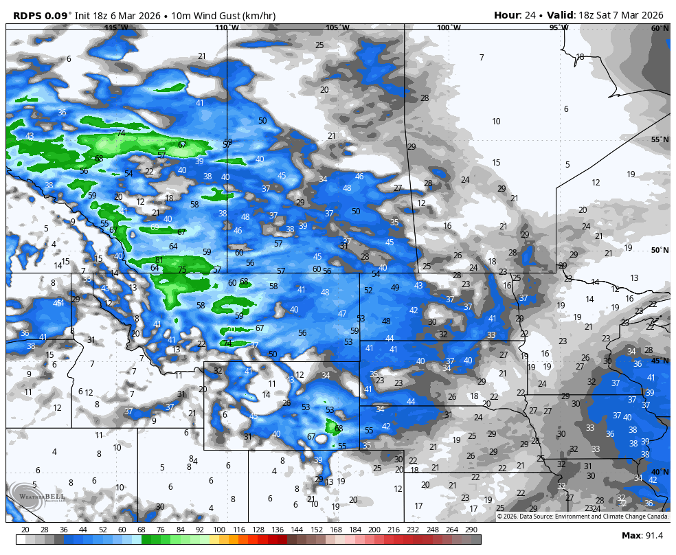 The rdps model showing showing wind gusts on Saturday at 11am mt. courtesy of WeatherBell.