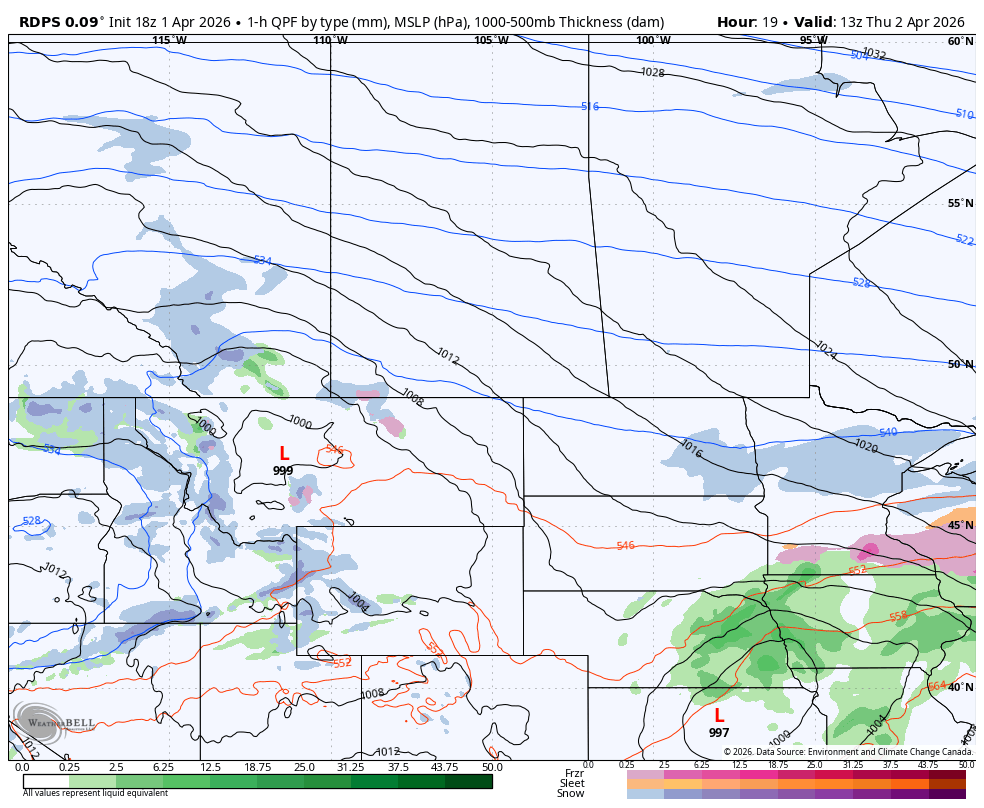The rdps model showing precipitation type and intensity at 7Am MT on Thursday, courtesy of WeatherBell.