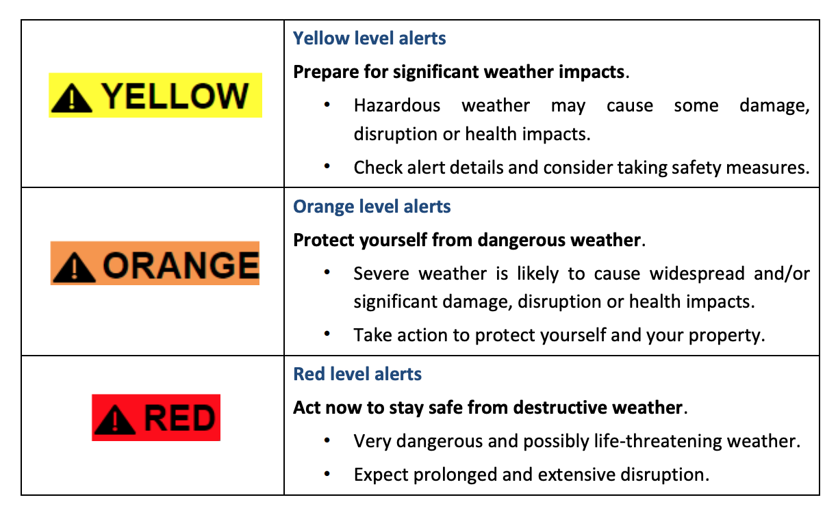 For the first time, advisories, watches and warnings will come in one of three colour options: