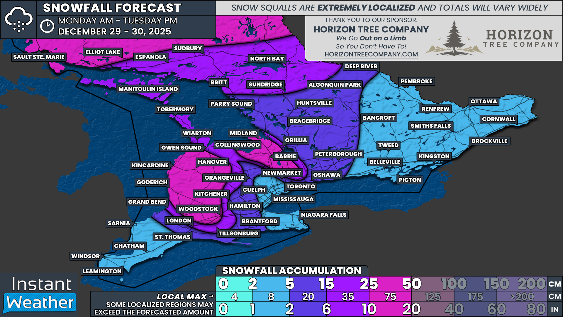 These powerful winds, when combined with heavy snowfall, will lead to blizzard conditions developing east of Lake Huron and southeast of Georgian Bay. Snow squalls will also intensify as the system pulls away, resulting in widespread snowfall totals of 25 to 50 cm across Grey-Bruce, Huron, Perth and Simcoe counties by the end of Tuesday.