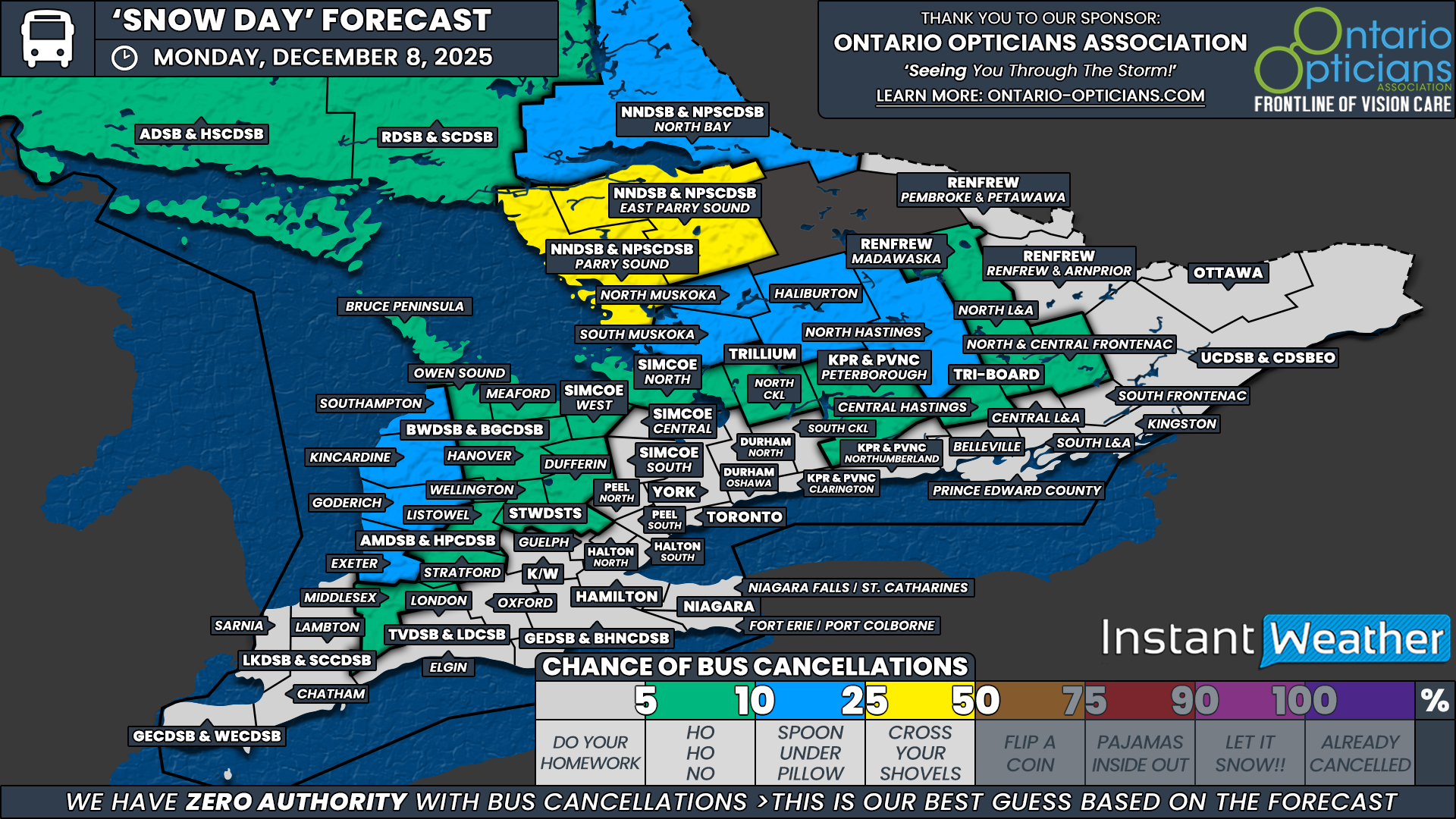 There is, however, a low to slight chance (10 to 25 percent) for parts of Central Ontario, including regions under the Near North District School Board, as well as Muskoka and Haliburton within the Trillium Lakelands District School Board, and North Hastings under Tri-Board Student Transportation Services.