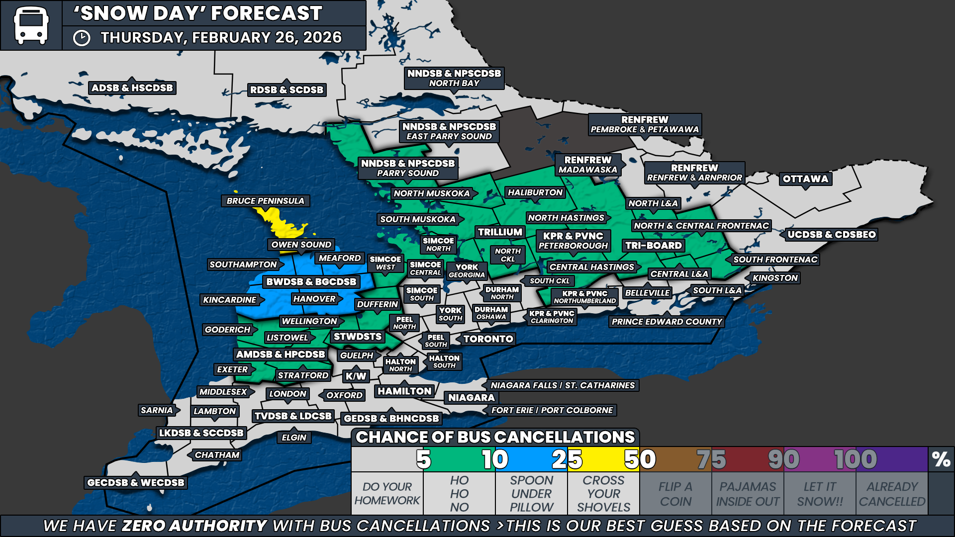 If we do see any cancellations on Thursday, the most likely location would be the Bruce Peninsula under the Bluewater District School Board. There is still the potential for a narrow band of snow squall activity to persist into the mid-morning hours in that area. That said, confidence in the exact placement and intensity of those bands is fairly low. Because of that uncertainty, we’ve assigned a 25 percent chance of bus cancellations for the Bruce Peninsula under BWDSB.