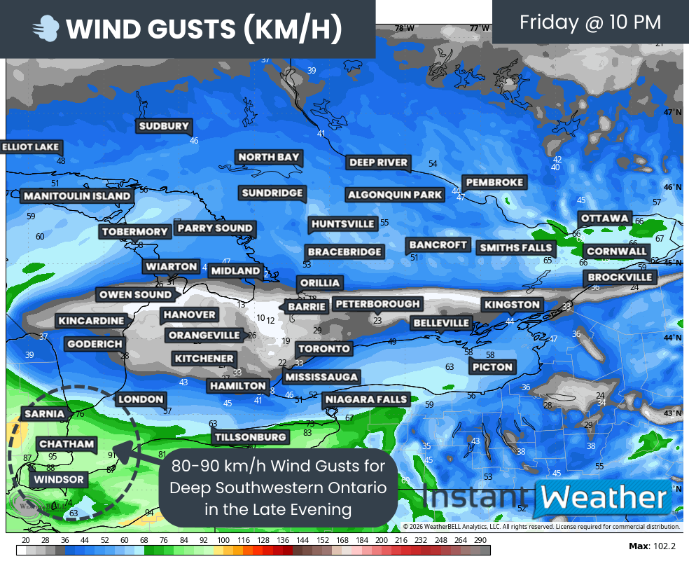 We are also watching the evening hours closely for Deep Southwestern Ontario, where stronger wind gusts may develop just before midnight.