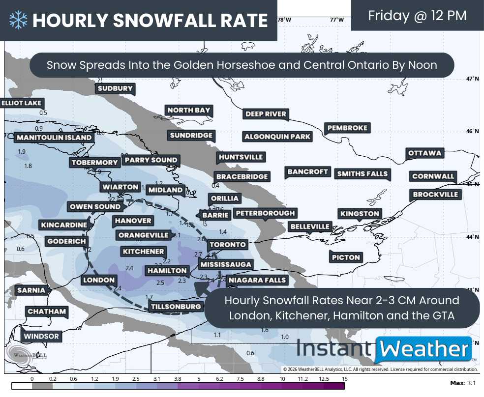 That swath of snow will pick up intensity through the late morning with it spreading eastward into the Greater Toronto Area and regions around Lake Simcoe by around the noon hour. As this occurs, snowfall rates are expected to increase across parts of the region.