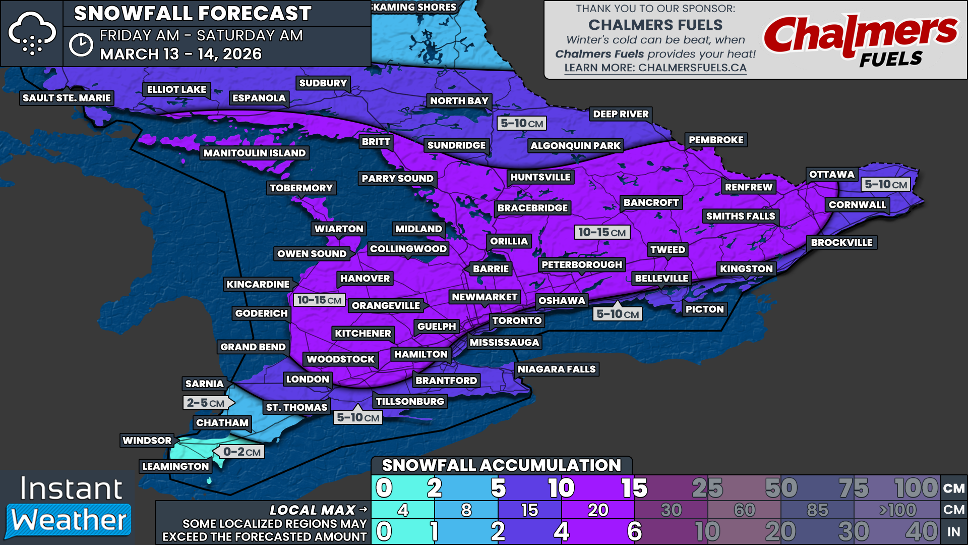 Overall, we are looking at general snowfall amounts of 10 to 15cm across much of Southern Ontario by Saturday morning.