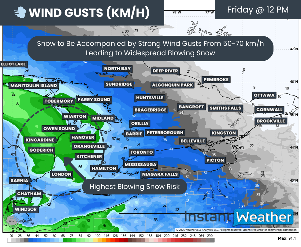 This heavy snow will also be accompanied by strengthening winds with gusts approaching 50 to 70 km/h across many areas. Even stronger gusts are expected around Lake Huron, where some locations could see gusts approaching 80 km/h.