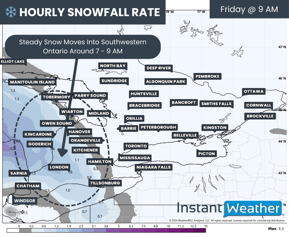 That means locations around Lake Huron will likely be the first to experience the steady snowfall. The snow should start out fairly light early in the morning before gradually increasing in intensity.