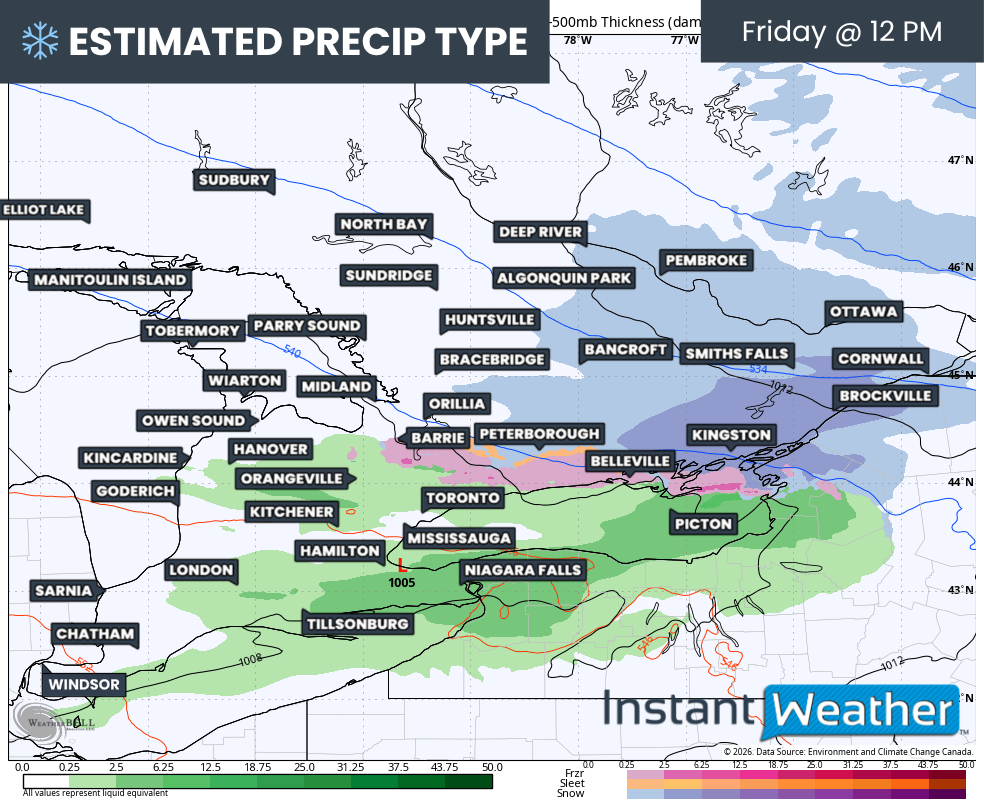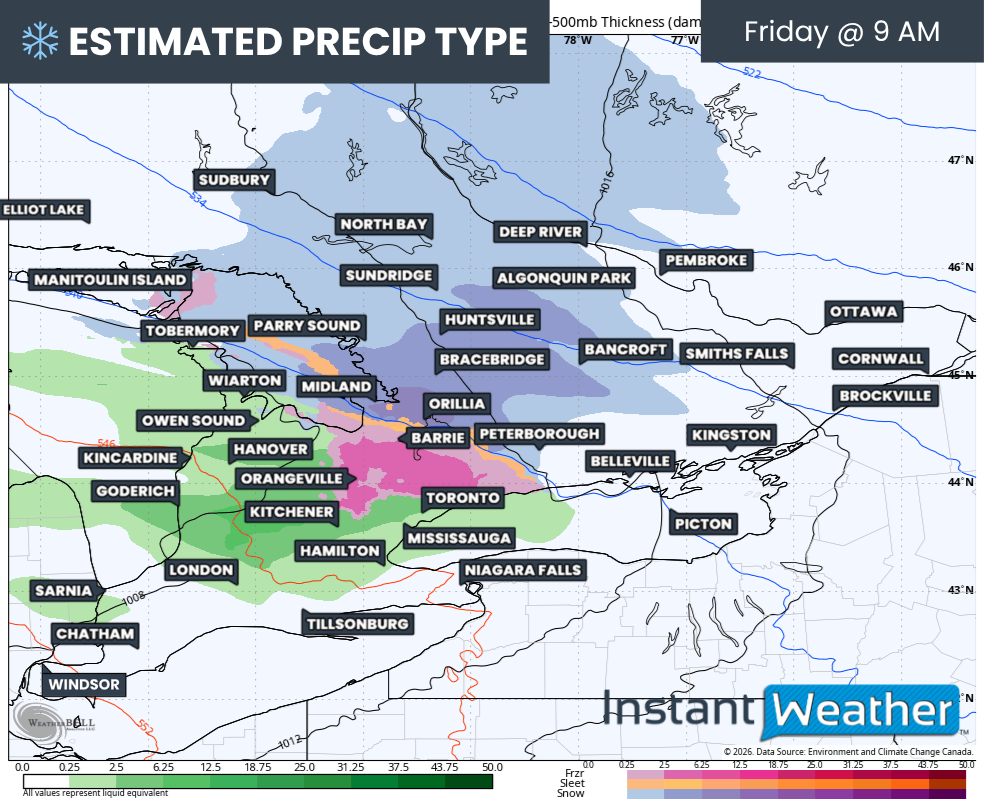 There is still some uncertainty when it comes to exact precipitation types, as temperatures will gradually rise through the day. In many areas, it will likely begin as snow, then transition to ice pellets, followed by a period of freezing rain, before eventually changing over to regular rain. South of Lake Simcoe, the main transition will be from ice pellets to freezing rain.