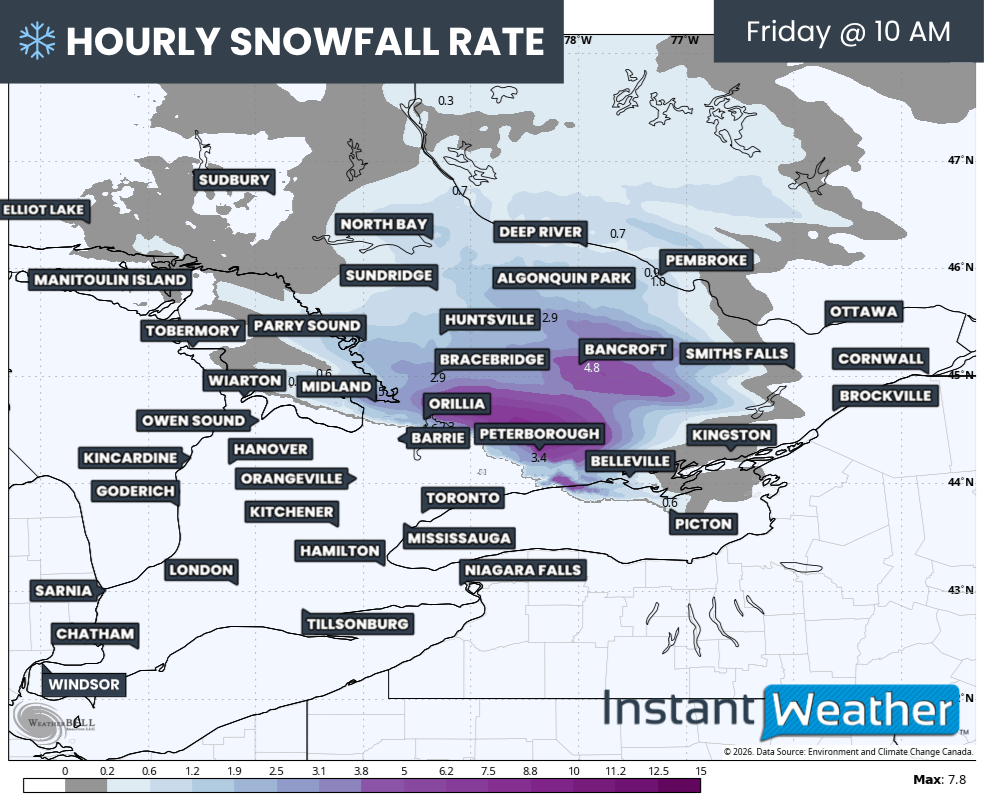 The snow band moving through Muskoka, Peterborough, and into Eastern Ontario could be quite intense at times. Snowfall rates may briefly reach 3 to 6 cm per hour late in the morning into the early afternoon. Some of this precipitation may fall as ice pellets, which could reduce overall snow totals slightly.