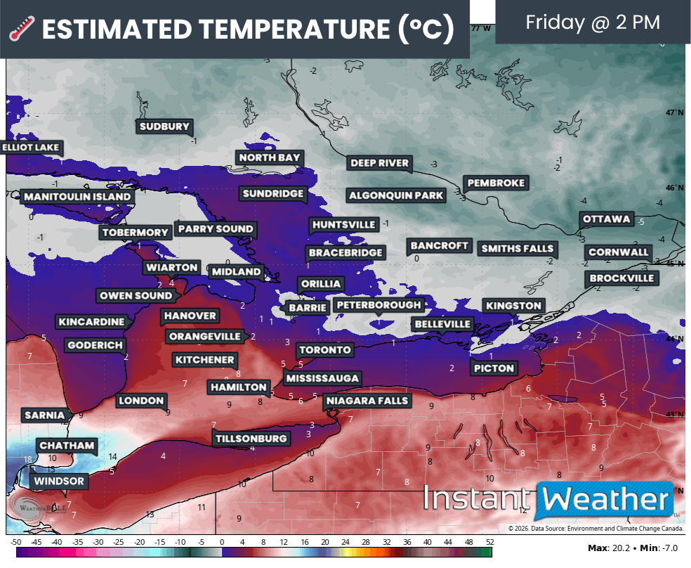 Temperatures will vary significantly across the region on Friday afternoon. Deep Southwestern Ontario, including Windsor, Leamington, and Chatham, could surge well into the double digits and approach 20°C. Meanwhile, Central and Eastern Ontario may struggle to climb above the freezing mark.