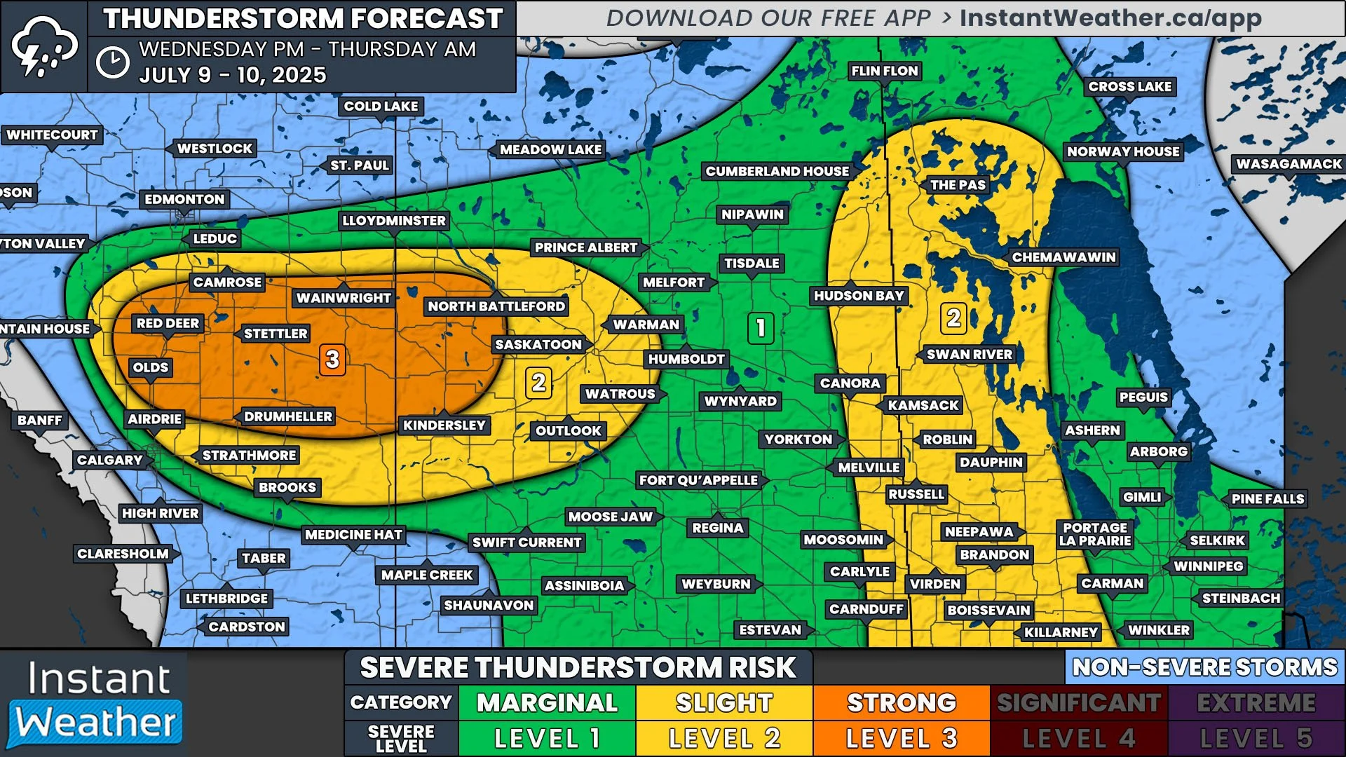 Strong Severe Storms Possible in Central Alberta & Saskatchewan, Uncertainty Further East and into Manitoba