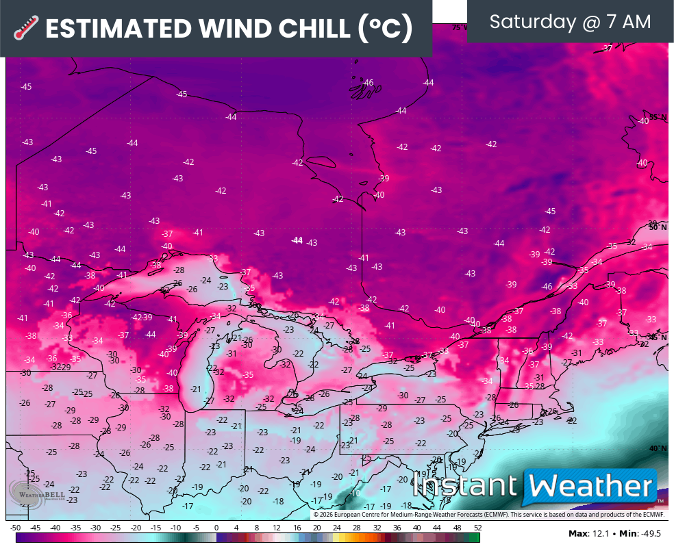 Northern Ontario will be under the core of this polar air mass, with some of the coldest air on Earth spilling south. Temperatures there could dip near or below -35˚C, with wind chills approaching -45˚C across much of the region. Some model guidance even suggests wind chills near -50, though that remains uncertain.