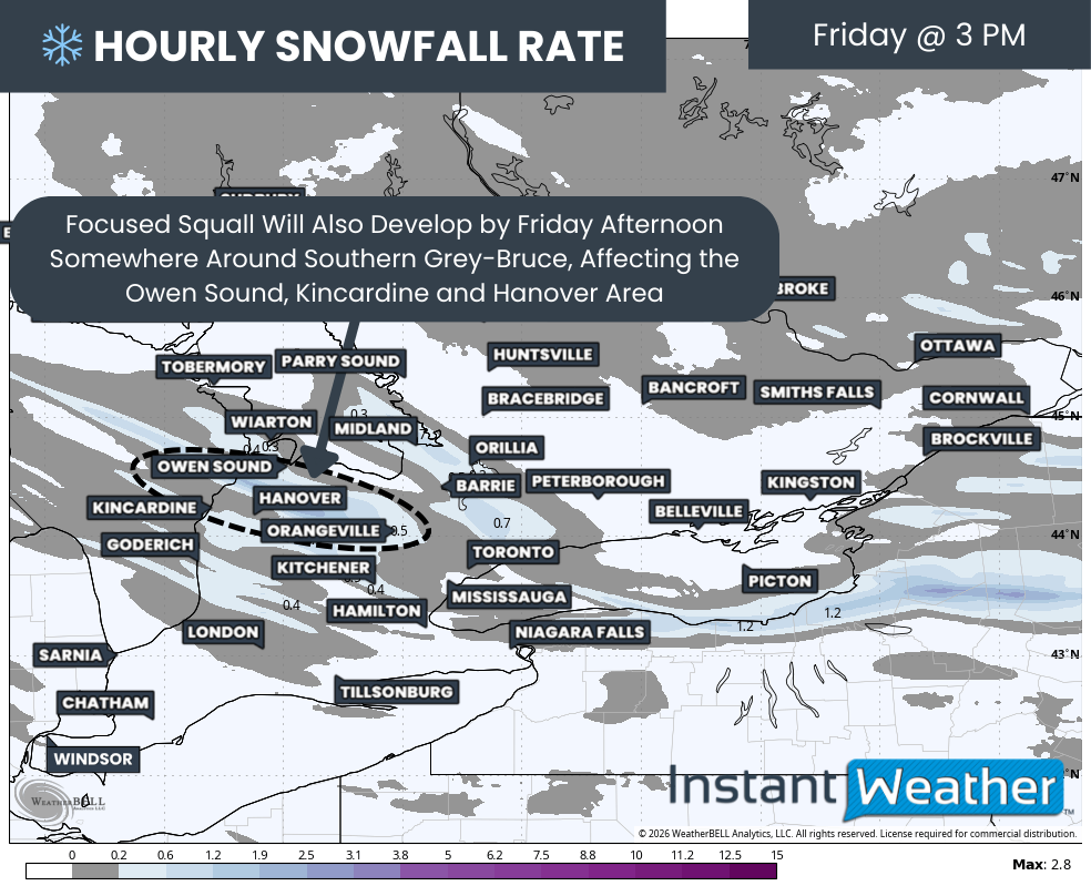 Attention will also turn to Lake Huron, where more organized lake effect activity is expected to develop east of the lake Friday afternoon. Current model guidance suggests the most intense and focused band will set up somewhere between Owen Sound and Kincardine, extending inland toward Hanover.