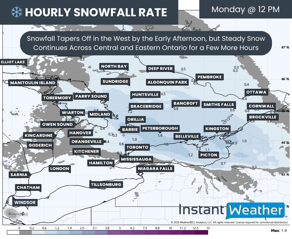 Snowfall intensity will gradually decrease through the early afternoon as the system moves away. Steadier snow will linger across Central and Eastern Ontario, while areas such as Kitchener and the GTA see snow slowly taper off as the system lifts north of Lake Simcoe.