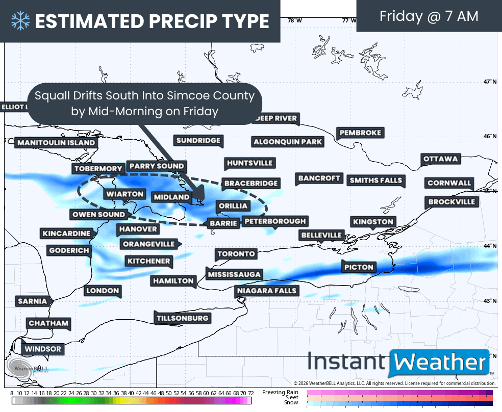 Overnight, snow squall activity currently affecting Parry Sound and Muskoka is expected to migrate southward and settle somewhere between southern Muskoka and northern Parry Sound by mid-morning Friday. This band could become quite persistent as it drifts south, heavily impacting travel corridors.