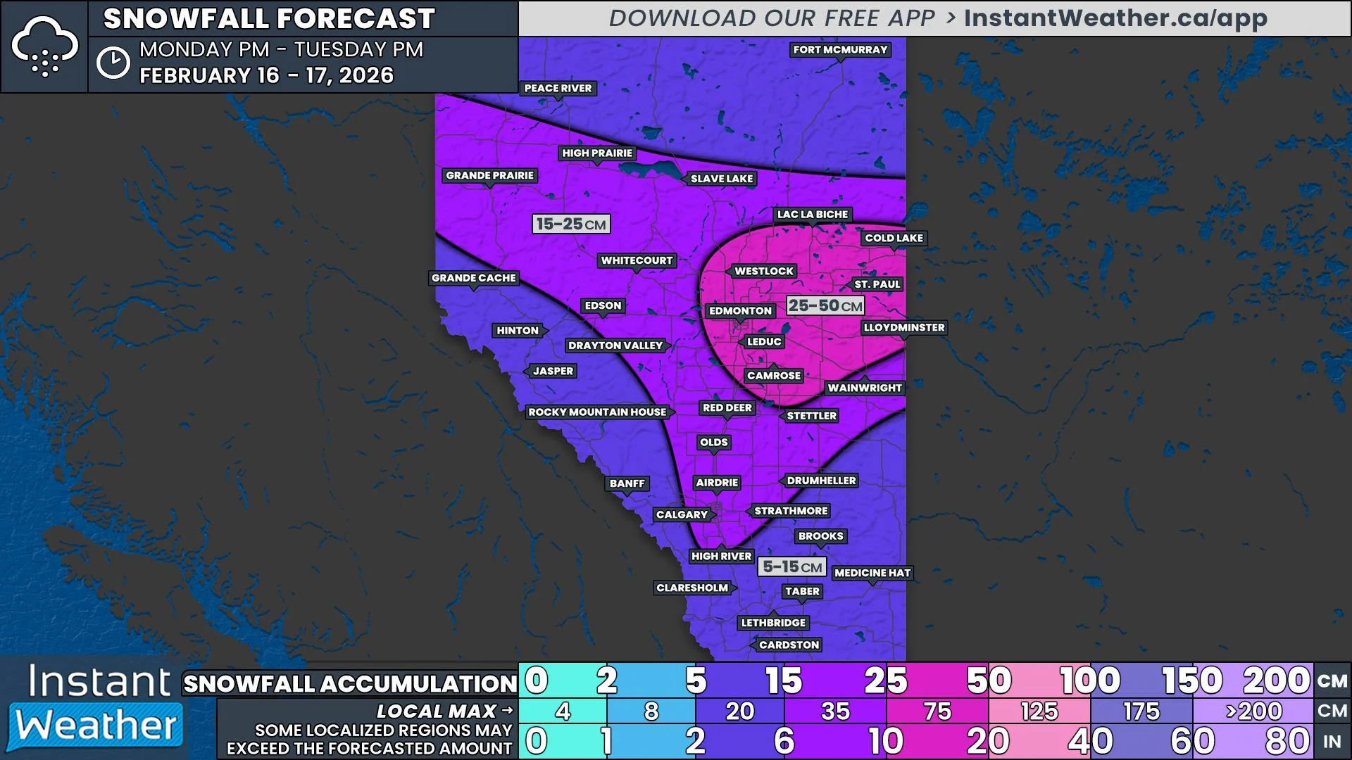 Overall, Southern and Central Alberta, and into Northern Alberta, can expect at least 5cm of snow by Wednesday morning. A considerable swath of this region, stretching from Calgary to Slave Lake and from Grande Prairie to Lloydminster, will see prolonged snow and possibly periods of heavier rates of snowfall. This will result in over 15cm of snow accumulating. East Central Alberta, from Edmonton to the Saskatchewan border, can expect more than 25cm of snow, with the possibility of locally higher amounts approaching 40cm,
