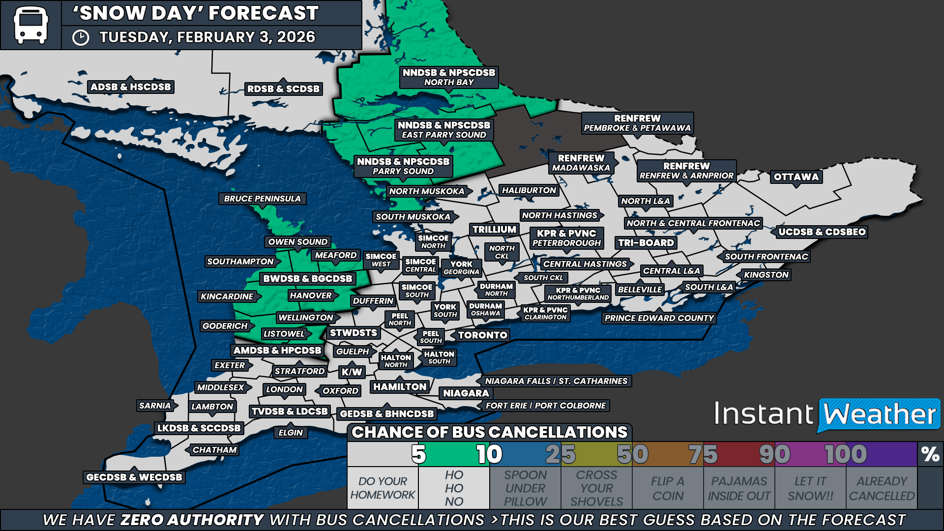 Ottawa in particular is expected to see significant snowfall, but given the urban nature of the school board and its typically higher threshold for cancellations, there remains a small chance buses could still run if conditions improve faster than expected.